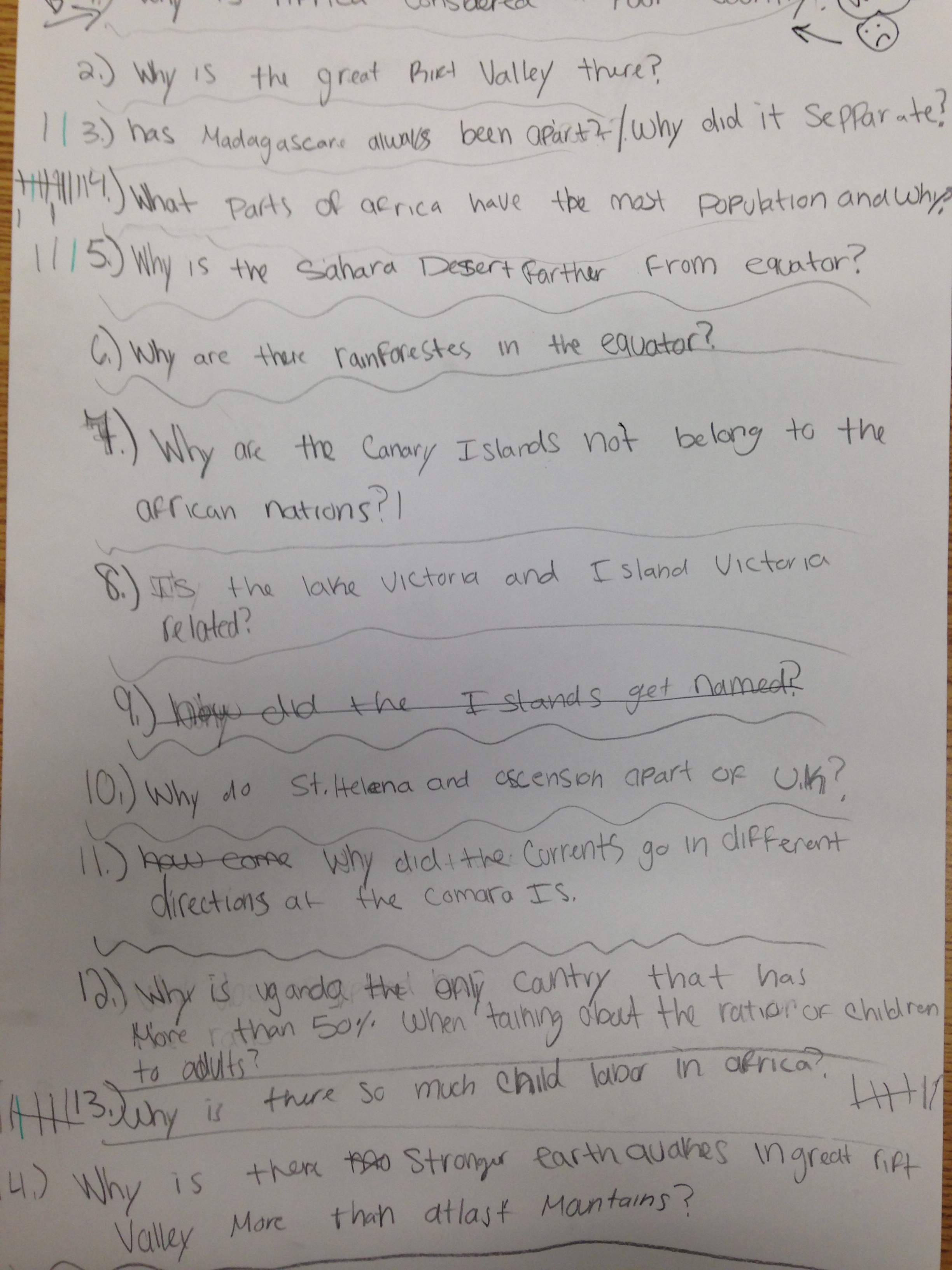 The result was fabulous. The kids’ eyes were afire with energy and you could feel the pulse of the class ready to rush forward into their discovery of the continent. We followed that activity up the next day with a museum walk of all the questions students came up with the day before and narrowed each class down to a top five. It was a complete coincidence that each of my four classes shared at least two of the questions that all the other classes. Here are a few of their questions. Keep in mind these questions were all generated by 11-12 year old 6th graders: