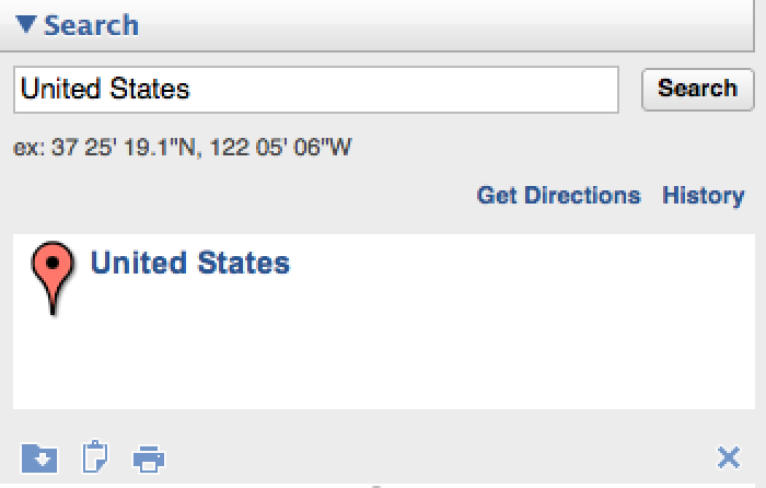 - The top panel is call the Search Panel. This is where you can type in the name of a country, state, province, city, or even famous landmark. Google Earth will fly you there automatically.