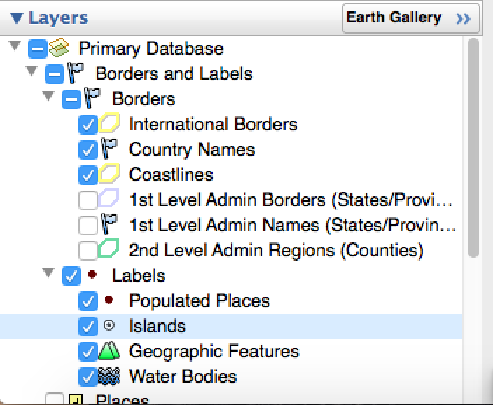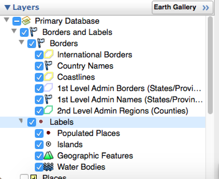 This panel contains all the cool bells and whistles for GE. Choose wisely! It’s great if you know what you want to layer but in the beginning I would turn everything OFF so you don’t get overwhelmed or distracted with all the extra bells and whistles. When you do start turning things on, start with simple things like Borders and Labels (note: you still might want to turn off some of the less used borders and labels like the counties)