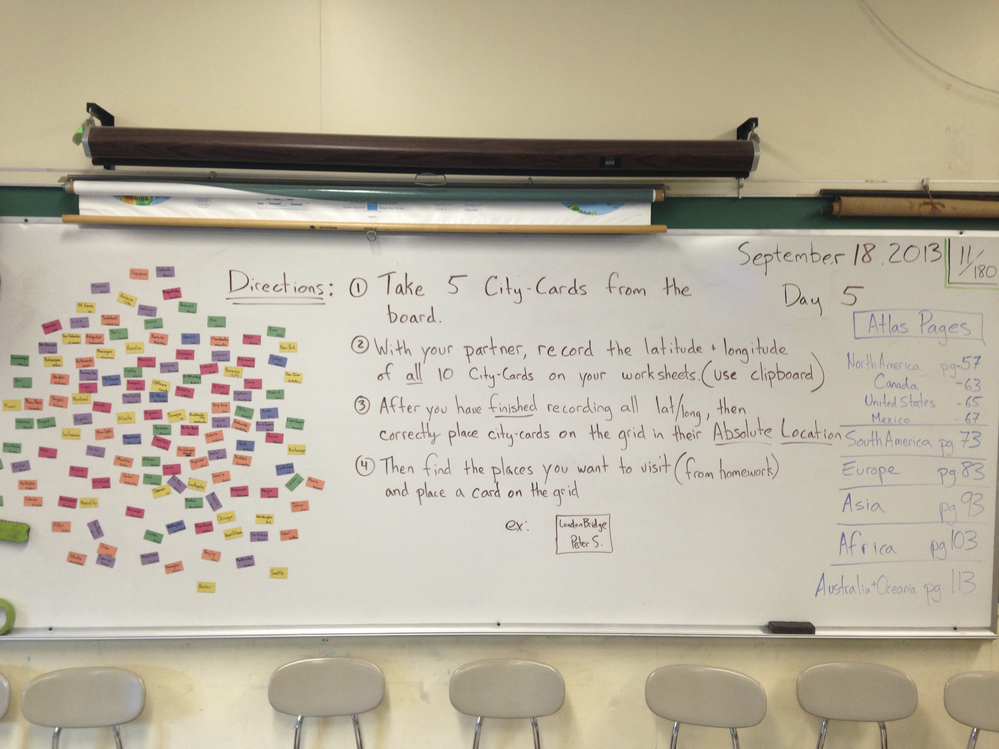 Each pair of students will take an atlas (if they want one) or they can use any globe, map or resource in the room. Altas pages for each continent are listed on the right side of the whiteboard for reference. The directions are simple.
