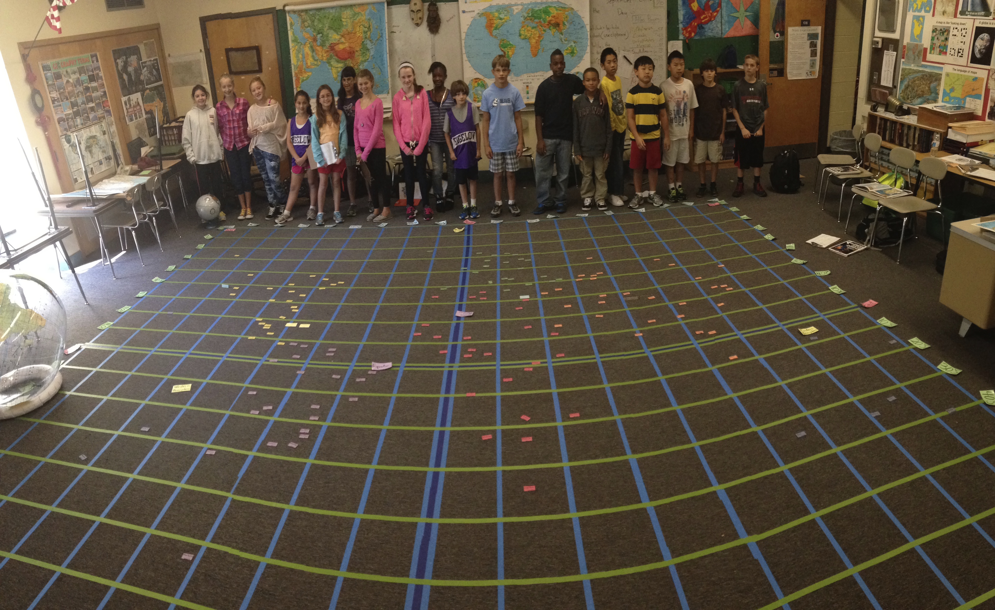 After 20-30 minutes of work I stop the class and ask everyone to move to the south pole of the room and observe what patterns, if any, they see emerging. If students have worked together as a team and finished all the cards, they will instantly see how the Grid has transformed into a map of the world.